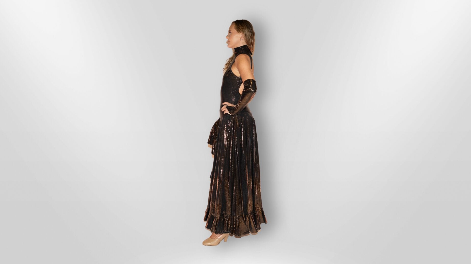 Infused with Amanda J Thompson’s legendary design expertise—honed through decades as the creative force behind the world-famous Hot Ice Show costumes—this piece is designed to perform as flawlessly as it looks. The snake-skin effect adds a daring edge while maintaining couture-level elegance, reflecting Amanda’s mastery of impactful, stage-ready design.
